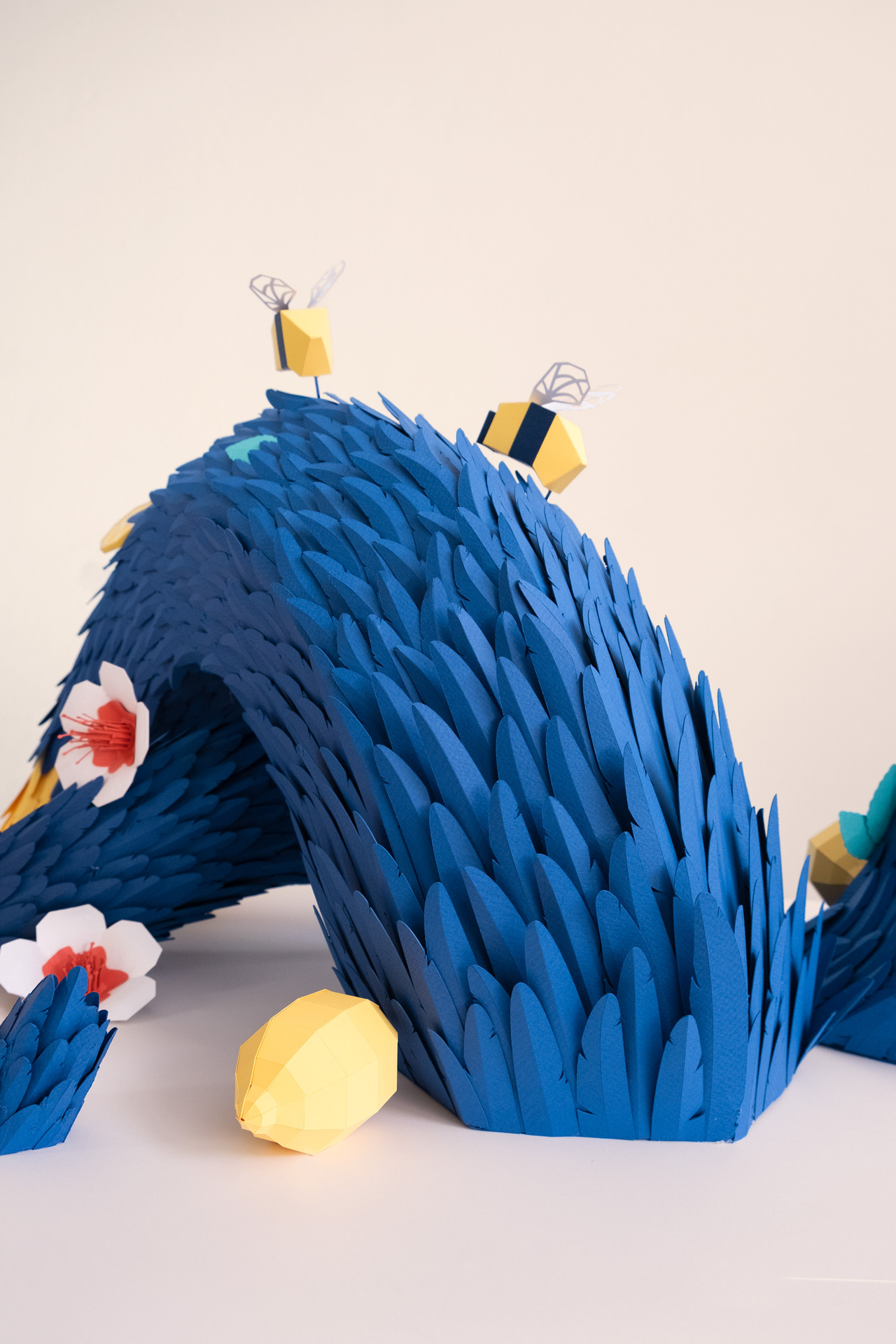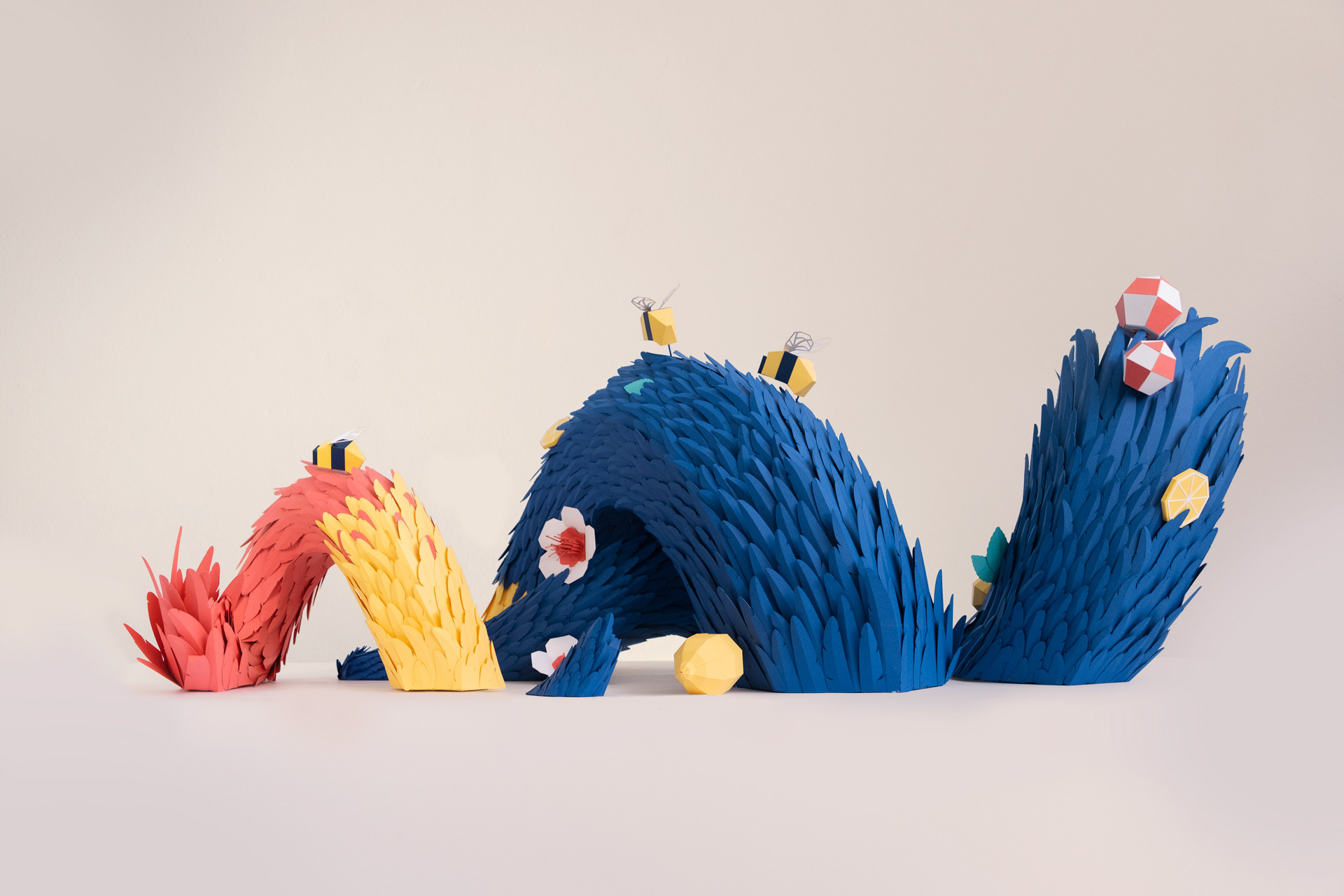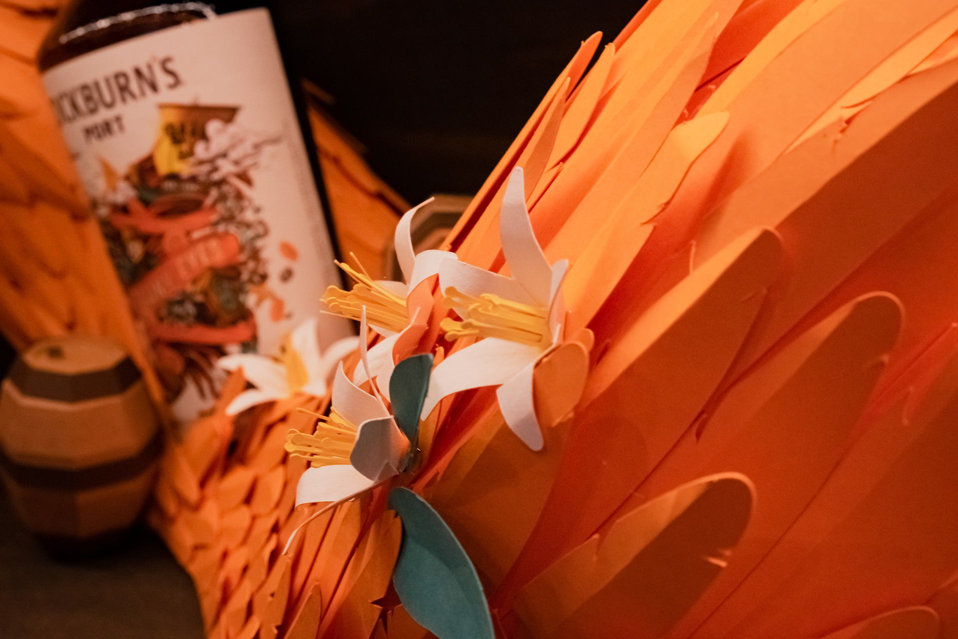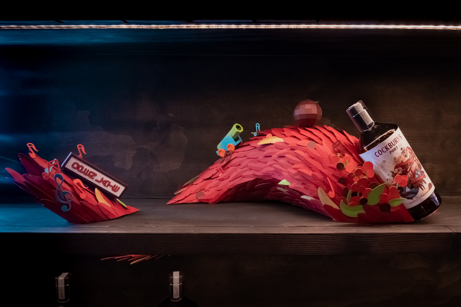 These series of morphic and dynamic shapes were covered in paper feathers, symbolizing the tail of the rooster, and different objects were then placed in each piece to transmit the different flavors and concepts of each bottle.