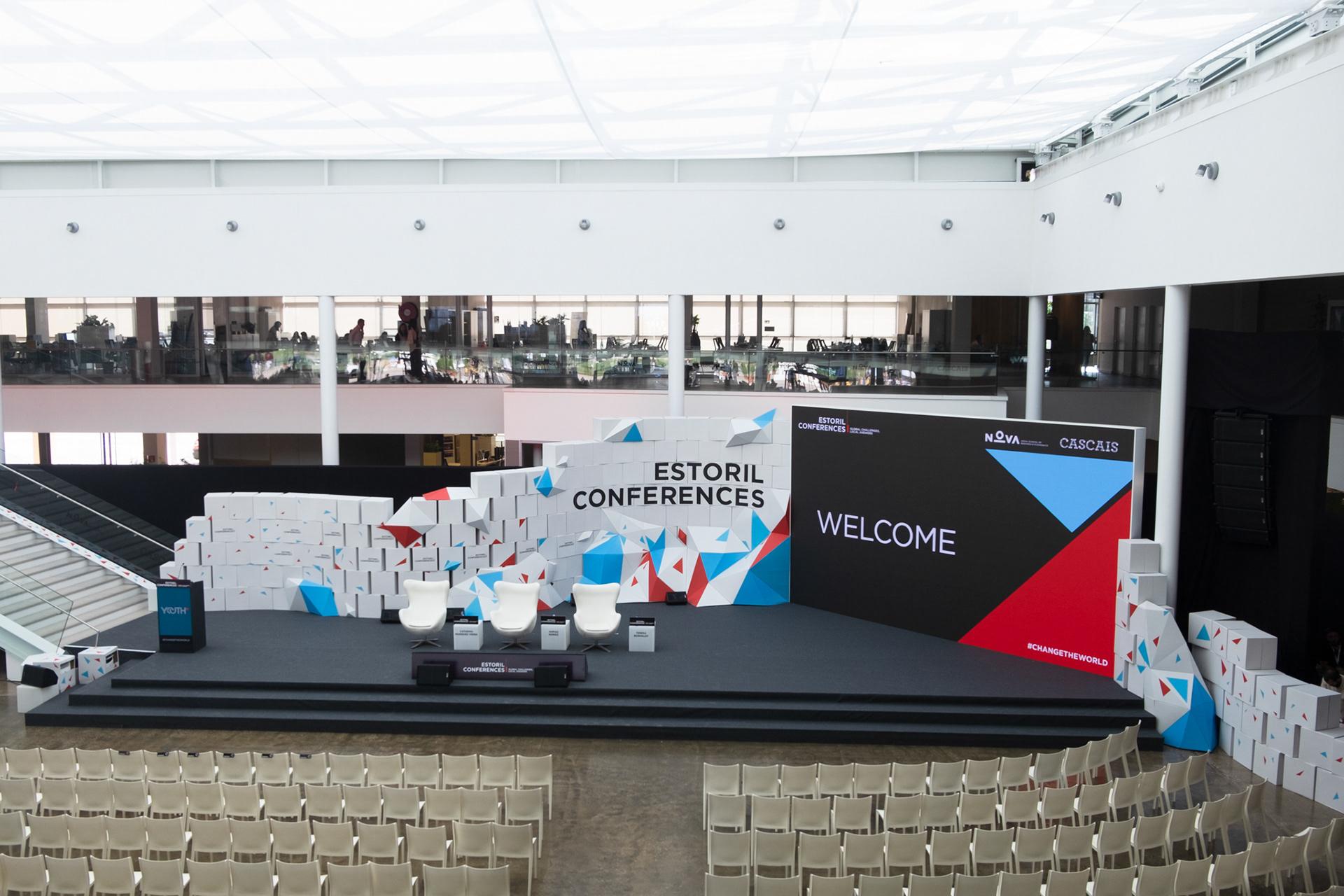 Estoril Conferences are a global gathering looking for local answers to the global challenges. It happens every two years in the city of Cascais and in 2019 we were challenged to design the event stage and venue. Using thousands of cardboard boxes we divided the space and created different zones for sponsors and other relevant areas. The event identity was present through all cardboard installations with its colors and triangular shapes.