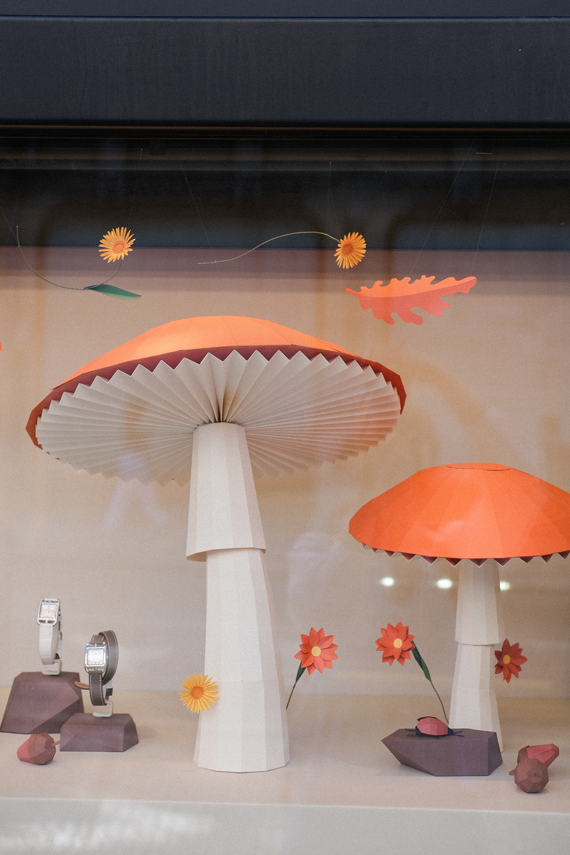 This window celebrates the arrival of autumn, where mushrooms, dancing leaves, ladybugs, and a gentle snail welcome the new season.