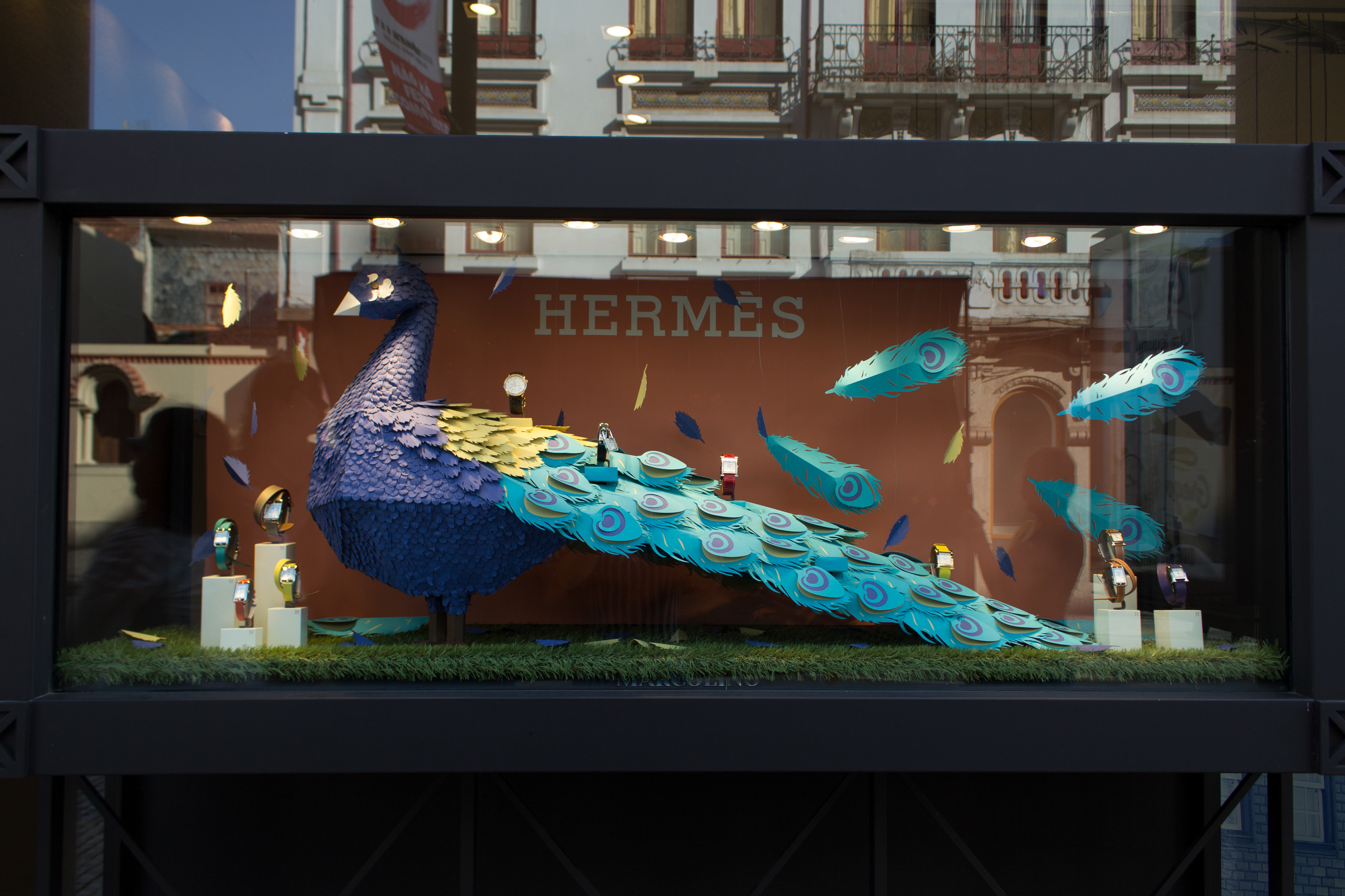 J. Borges Freitas challenged us to use Hermès wristwatches collection’s colors and create a peacock for Marcolino’s window.