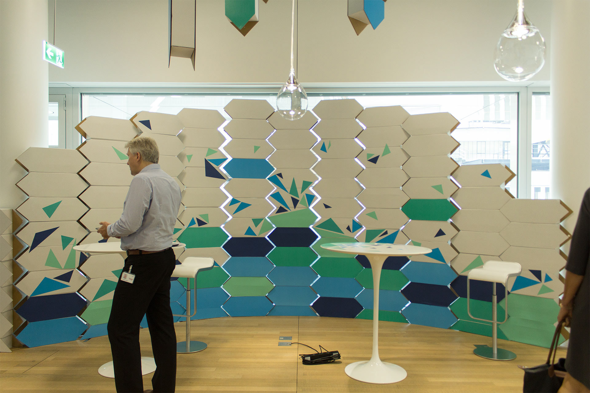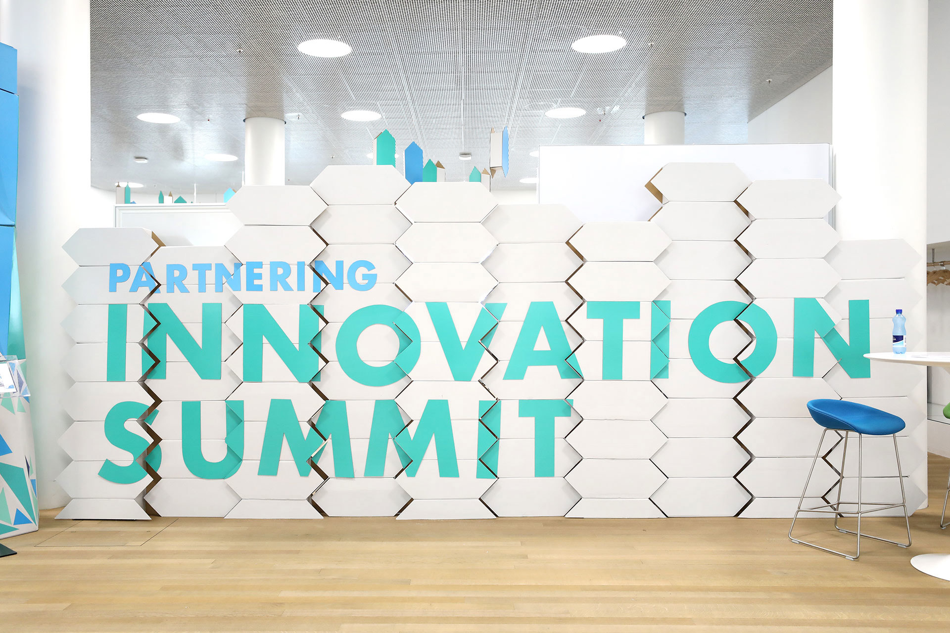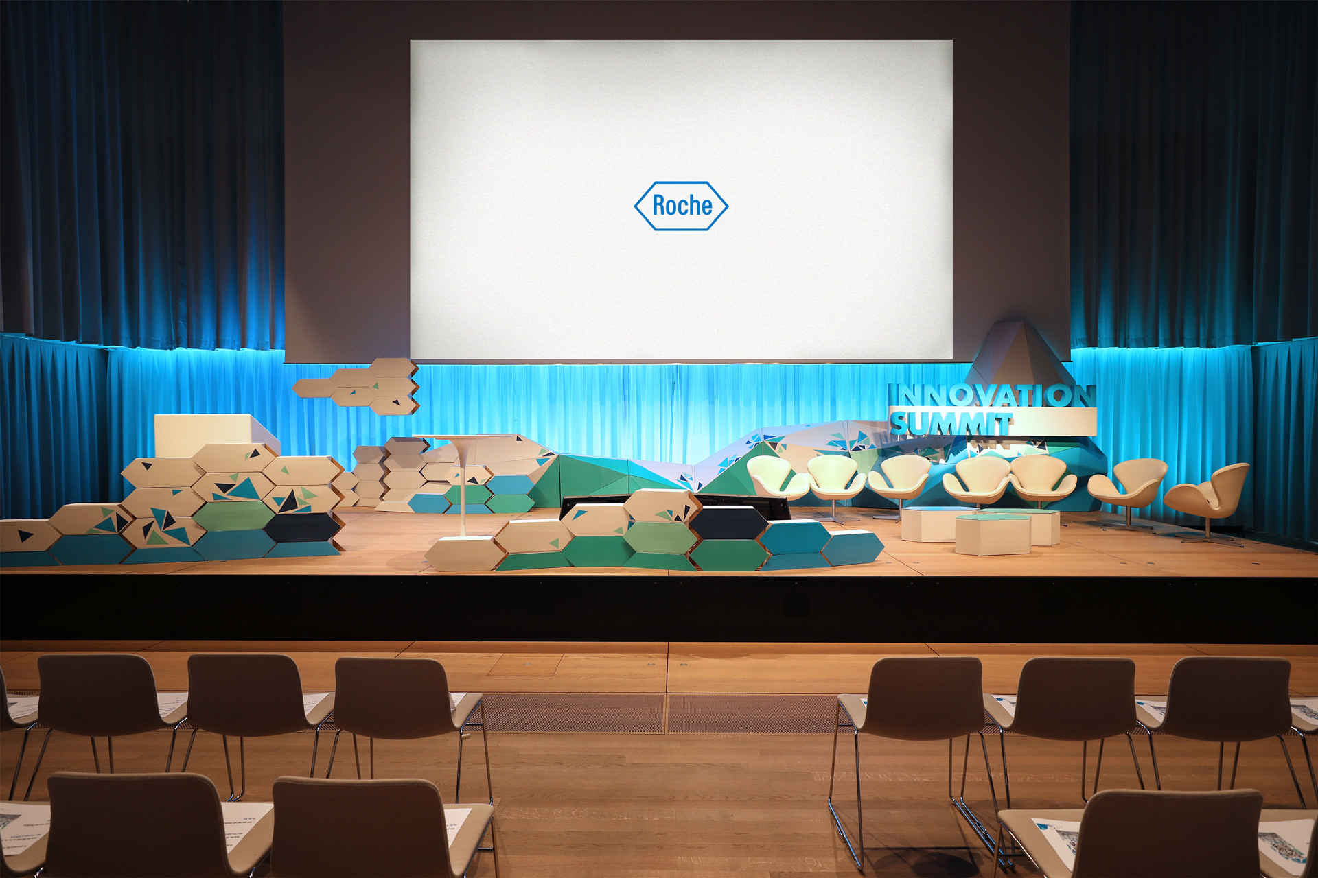 Picking up Roche‘s logotype form we created a cardboard module that would accompany the event’s venue and stage, though walls and polygonal shapes referent to the summit’s identity.