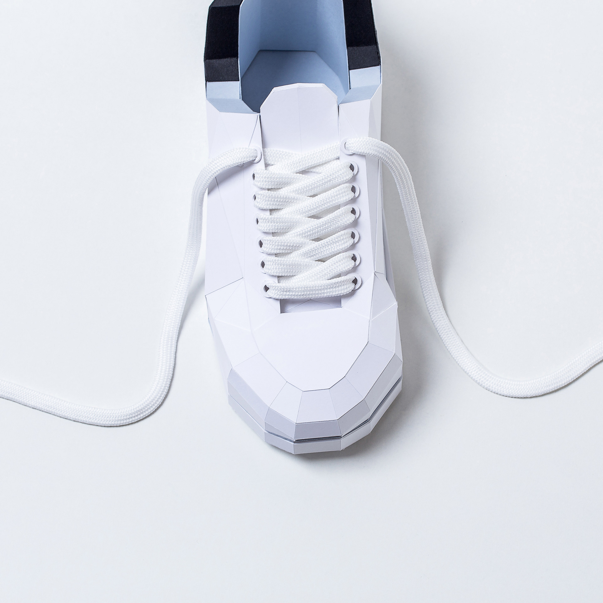 To highlight its features, they needed a blank shoe, so they asked us to create in papercraft, a sneaker, a boot and a shoe all in white. This was the result.