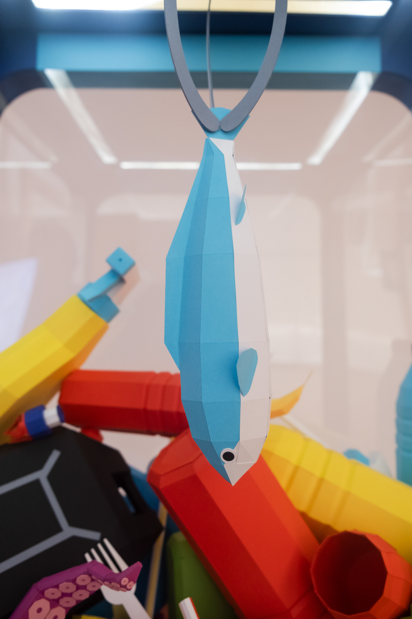 Inside this colorful, light-filled box, usually filled with teddy bears and other toys, we placed bottles and plastic objects, turning the game into a search for a fish amid the rubbish.